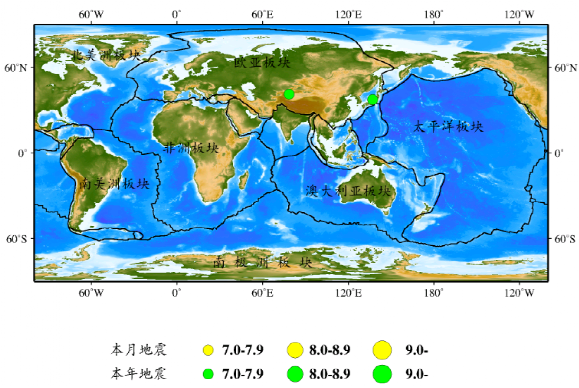 2024年2月全球發生未發生7級以上地震。本月全球7級以上地震活動水平較上月有所減弱(上月全球7級以上地震2次)。