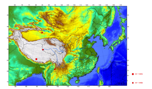 ? ?本月(2025年5月)全國發(fā)生4級以上地震4次(圖2,表1),其中5級以上地震1次,為5月12日發(fā)生在西藏日喀則市拉孜縣5.5級地震。和上月相比本月4級以上頻次有所降低,但強度有所升高(上月全國發(fā)生4級以上地震8次,最大4.9級)。