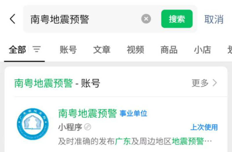 ①微信搜索:“南粵地震預警”小程序