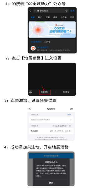 手機QQ搜索“QQ全城助力”關注并進入公眾號,點擊進入“地震預警”并做相關設置后,手機即可接收到地震預警信息。當關注地點預估地震烈度≥2度(輕微有感),即在手機通知欄里面推送預警信息;當關注地點預估烈度≥5度(強烈有感),手機將會收到全屏彈窗預警通知。