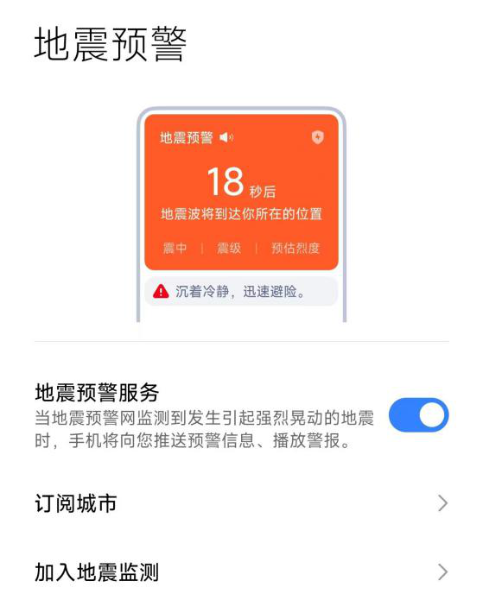 在小米手機里找到并打開“手機管家”應用;在手機管家的界面中,找到并點擊“預警中心”;在“預警中心”中,找到“地震預警”選項并點擊進入,選擇開啟地震預警服務。