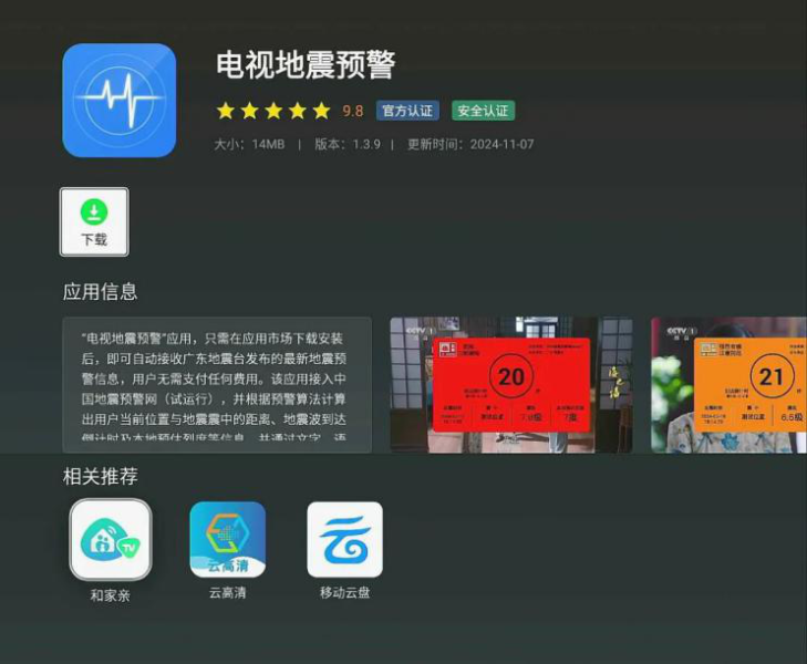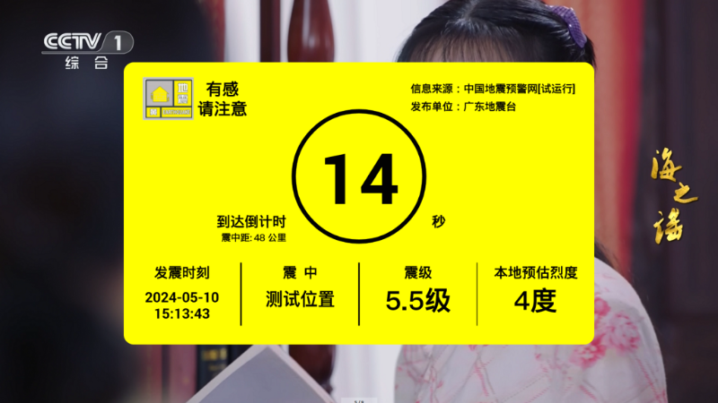 廣東省移動IPTV用戶可直接在應用市場搜索“電視地震預警”進行下載安裝,安裝完畢后即可實時接收廣東省及周邊地區最新地震預警信息。如用戶所在位置預估地震烈度達到2度及以上時,電視界面將會強制彈窗通過文字顯示、語音播報等方式展播地震預警信息。